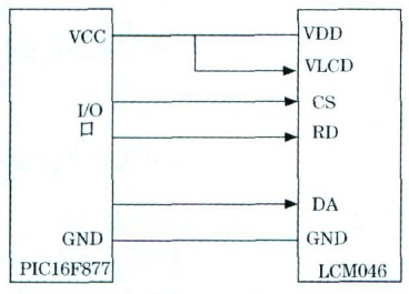 控制顯示電路以單片機(jī)為核心, 選用PIC16F877單片機(jī)為控制器, 其內(nèi)部含有10位高精度A /D轉(zhuǎn)化器, 能夠直接處理模擬電壓, 調(diào)整CAV424的GLP , 可以使輸出電壓范圍在2 5~ 35V 之間, 滿足單片處理信號(hào)的要求。顯示器件選用LCM 046液晶模塊, 其功耗低, 工作電流只有μA級(jí), 并且其與處理器連接簡(jiǎn)單。連接圖如圖4所示。