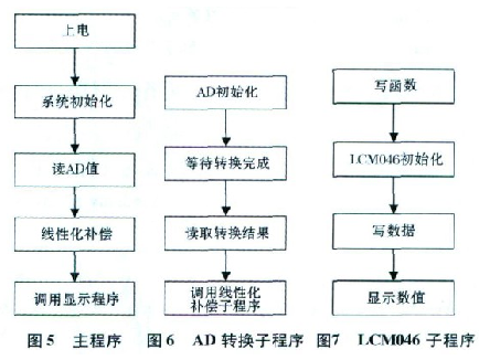 軟件設(shè)計(jì)主要包括A /D 轉(zhuǎn)換程序和LCM 046 數(shù)據(jù)顯示兩部分。另外還有非線性補(bǔ)償部分, 在線性不好的情況下可以采用插值法進(jìn)行必要的線性補(bǔ)償。軟件流程圖設(shè)計(jì)如圖5、圖6、圖7所示。