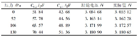 試驗(yàn)中差動(dòng)式電容傳感器的低壓端連接CAV424的C X2管腳, 高壓端連接C X1管腳。根據(jù)差動(dòng)電容值的變化范圍, Cosc這里取82 pF, 則fOSC = 29. 036 kH z;GLP = 1 +RL1/RL2中的RL 1, RL2分別取300Ω 和100 Ω , 這樣使得CAV424輸出的電壓范圍在25~3 75 V, 在ADC 模擬輸入范圍內(nèi)。試驗(yàn)中選取兩種量程的電容傳感器作為實(shí)驗(yàn)的測(cè)試對(duì)象, 分別是130 Pa 和10M Pa 兩種。