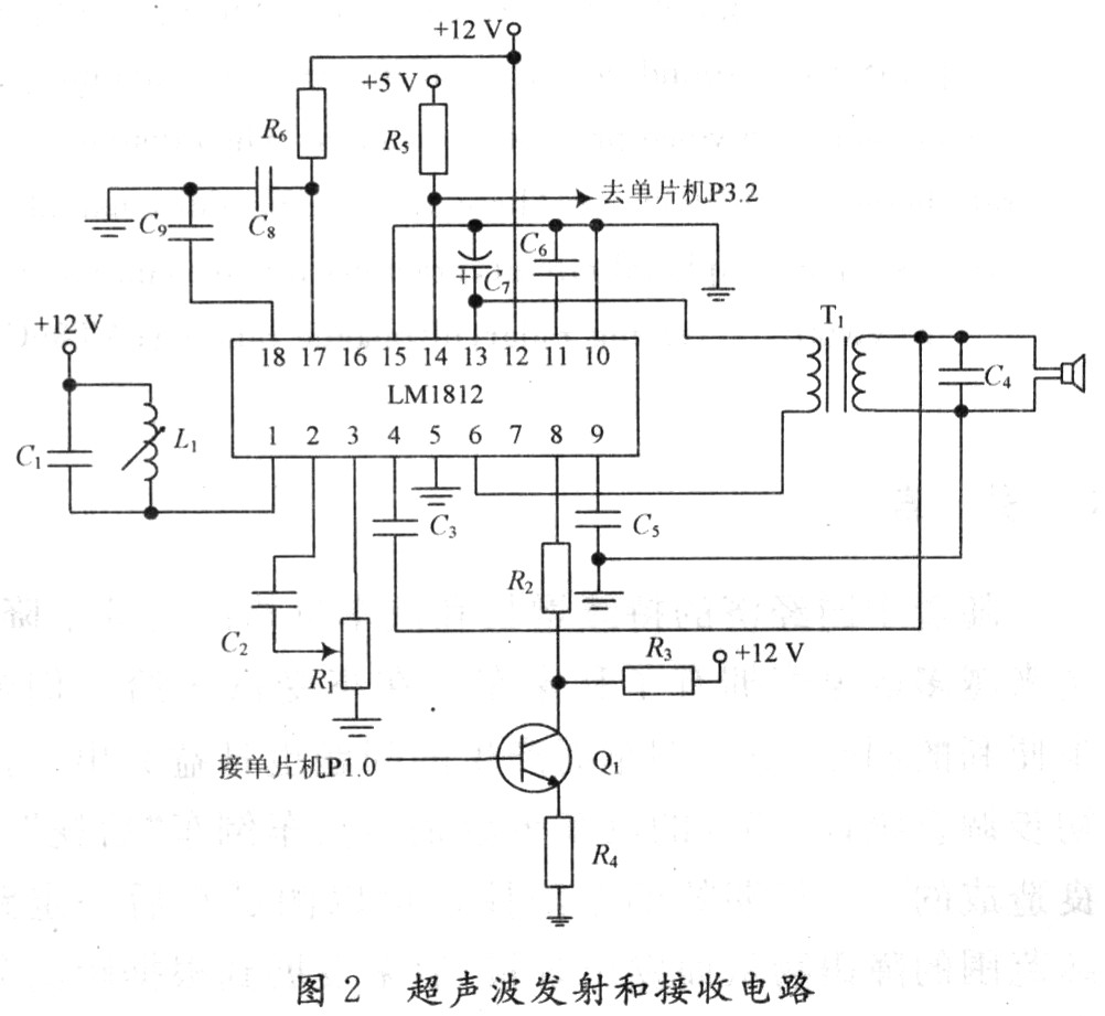 系統(tǒng)框圖如圖1所示。該系統(tǒng)由單片機(jī)控制電路、超聲波發(fā)射與接收電路、溫度補(bǔ)償電路、LCD顯示電路以及語(yǔ)音報(bào)警電路等幾部分組成。單片機(jī)AT89C51是整個(gè)系統(tǒng)的核心部件,協(xié)調(diào)各部分電路的工作。單片機(jī)在超聲波信號(hào)發(fā)射的同時(shí)開始計(jì)時(shí),超聲波信號(hào)在空氣中傳播遇到障礙物后發(fā)生反射,反射的回波信號(hào)經(jīng)過(guò)處理后輸入到單片機(jī)的INTO端產(chǎn)生中斷,計(jì)數(shù)器停止計(jì)數(shù)。通過(guò)計(jì)數(shù)器測(cè)得的脈沖數(shù)可得到超聲波信號(hào)往返所需要的時(shí)間,從而達(dá)到測(cè)距的目的。超聲波探頭選用TCF40-25TR1型收發(fā)一體式超聲波傳感器,諧振頻率為40 kHz;超聲發(fā)射與接收電路采用LM1812專業(yè)集成電路,不僅外圍元件較少,電路簡(jiǎn)單,而且有更好的穩(wěn)定性及可靠性;溫度補(bǔ)償電路采用一線制數(shù)字溫度傳感器DS18B20,利用聲速和溫度之間的關(guān)系對(duì)聲速進(jìn)行校正,從而消除溫度對(duì)聲速的影響;語(yǔ)音報(bào)警電路采用ISD4004,可實(shí)現(xiàn)汽車倒車過(guò)程中的語(yǔ)音報(bào)警。