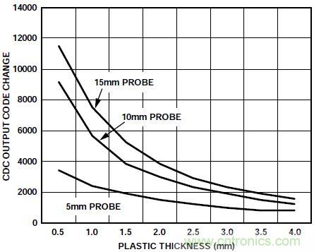 圖2所示為從CDC測量到的輸出數(shù)據(jù)。該數(shù)據(jù)表明,傳感器響應(yīng)隨塑料厚度的增加而減少。CDC輸出降至500個(gè)碼以下時(shí),按鈕傳感器的響應(yīng)會(huì)不夠。此時(shí)很難區(qū)分真正的傳感器激勵(lì)和CDC代碼中的噪聲。10 mm按鈕可配合上方大至4 mm的塑料使用。傳感器越小,響應(yīng)越小。對(duì)5 mm的按鈕而言,傳感器響應(yīng)可降至約500個(gè)碼。對(duì)5 mm按鈕而言,建議采用2 mm或以下的覆蓋塑料來確保傳感器正常工作。