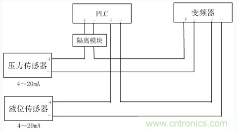 對于傳感器輸出的電流信號,只經(jīng)PLC和變頻器的輸入阻抗之和不大于傳感器的輸出負載阻抗即可,壓力傳感器的信號可以同時串入PLC和變頻器,如只有壓力傳感器信號,則PLC和變頻器也都可以正常接收壓力傳感器的信號。而當液位傳感器的信號也同時接入PLC和變頻器時,因PLC接收信號的-端都在變頻器的+端,當兩傳感器的信號電流不一樣時,就有可能使PLC兩-端的電位有較大的差異,就就形成了共模干擾電壓。如PLC輸入端又互相不是隔離的,則會造成PLC的模擬信號輸入端接收不正常。變頻器的兩輸入信號是在PLC的后面,其-端電位可保持在變頻器內(nèi)部電路設(shè)定的狀態(tài),問題不大。