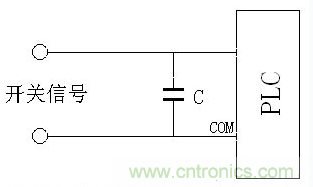 有時PLC或其它控制器的開關(guān)量輸入由于受外界干擾影響而瞬間輸入錯誤,導(dǎo)致PLC產(chǎn)生誤動作,這時在PLC的輸入端并上一個0.1uF的小電容就可以消除這種干擾,如下圖所示:
