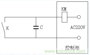 由于開關(guān)K離接觸器KM較遠,兩根電線很長導(dǎo)致其分布電容C將變得很大,在交流電路中,這個分布電容中將有位移電流流過,即使開關(guān)K斷開也可能因KM維持能量不需太大而導(dǎo)致KM不釋放,設(shè)備停不下來,此時,可以按以下方法解決: