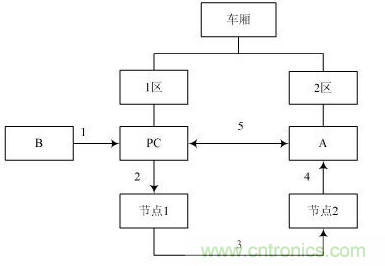 系統(tǒng)設(shè)計方案非常簡單。一般來講火車車廂全長26.6 m ,而無線傳感器網(wǎng)絡(luò)(wireless sensor net2works ,WSN)的通信距離在幾十米到幾百米之間,一般為30 m ,因此一個節(jié)點(diǎn)就可以完全覆蓋整個車廂。在系統(tǒng)中只有2個節(jié)點(diǎn)(不需PC協(xié)助) :節(jié)點(diǎn)1作為發(fā)信者,節(jié)點(diǎn)2作為收信者,組成最簡單的網(wǎng)絡(luò),不需跳轉(zhuǎn)。系統(tǒng)的結(jié)構(gòu)簡單,使得傳輸時延非常小,比較適合應(yīng)用在上文中提到的場合。
