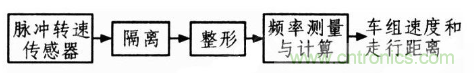 從上式可知,測(cè)量列車速度就是檢測(cè)列車車輪轉(zhuǎn)速和列車輪徑。脈沖轉(zhuǎn)速傳感器安裝在輪軸上,輪軸每轉(zhuǎn)動(dòng)一周,傳感器輸出一定數(shù)目的脈沖,使脈沖頻率與輪軸轉(zhuǎn)速成正比。輸出的脈沖經(jīng)隔離和整形后直接輸入計(jì)算機(jī)CPU進(jìn)行頻率測(cè)量,再經(jīng)換算從而得出車組速度和走行距離閉。其原理框圖如圖1所示。