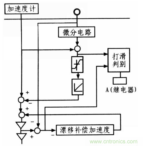 輪軸脈沖轉(zhuǎn)速傳感器也存在一定缺陷:即車輪空轉(zhuǎn)或打滑會(huì)使列車速度的測(cè)量結(jié)果存在誤差,為解決此類問題,在列車車軸上加裝一個(gè)加速度傳感器,配合脈沖轉(zhuǎn)速傳感器使用。該方式工作原理:在列車打滑期間,把機(jī)車的內(nèi)加速度作為測(cè)速的信息源,該信息與車輪旋轉(zhuǎn)的狀態(tài)等信息不相關(guān),而在其余工作時(shí)間仍用輪軸脈沖傳感器測(cè)速,所以該方式稱為基于慣性加速度傳感器的測(cè)速。在車輪打滑時(shí),由加速度傳感器測(cè)得加速度及車輪打滑前加速度的傾斜分量,而計(jì)算出車輪打滑時(shí)的列車運(yùn)行加速度,再將該值積分即得車輪打滑時(shí)列車實(shí)時(shí)運(yùn)行的速度。具體原理如圖2所示。