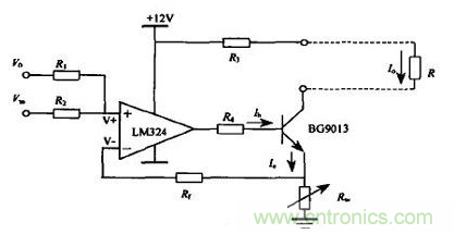 由圖1可見,電路主要元件為一運算放大器LM324和三極管BG9013及其他輔助元件構(gòu)成,V0為偏置電壓,Vin為輸入電壓即待轉(zhuǎn)換電壓,R 為負載電阻。其中運算放大器起比較器作用,將正相端電壓輸入信號與反相端電壓V-進行比較,經(jīng)運算放大器放大后再經(jīng)三極管放大,BG9013的射級電流Ie作用在電位器Rw上。