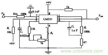 電阻Rs、R1、Rt和電容Ct直接影響轉(zhuǎn)換結(jié)果Fout,因此對元件的精度要有一定的要求,可根據(jù)轉(zhuǎn)換精度適當選擇,其中Rt、Ct、Rs、R1要選用低溫漂的穩(wěn)定元件,Cin可根據(jù)需要選擇0.1uF 或1uF 。電容C1對轉(zhuǎn)換結(jié)果雖然沒有直接的影響,但應(yīng)選擇漏電流小的電容器。電阻R1和電容C1組成低通濾波器,可減少輸入電壓中的干擾脈沖,有利于提高轉(zhuǎn)換精度。電路中的47Ω 電阻對確保電路線性失真度小于0.03% 是十分必須的。