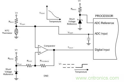 處理器的模數(shù)轉(zhuǎn)換器用于采集溫度模擬電壓(VteMP)。當(dāng)溫度超出臨界值時(shí),數(shù)字比較器的輸出端會(huì)驅(qū)動(dòng)處理器的輸入端進(jìn)行提示。