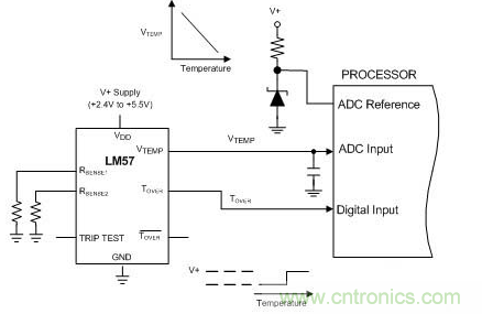 處理器的模數(shù)轉(zhuǎn)換器用于采集溫度模擬電壓(VTEMP)。當(dāng)溫度超出臨界值時(shí),過(guò)熱(TOVER)輸出端會(huì)驅(qū)動(dòng)處理器的輸入端進(jìn)行指示。跳脫點(diǎn)由兩個(gè)無(wú)源電阻器(RSENSE1和RSENSE2)設(shè)置,而不是由有效參考端和偏壓電阻器設(shè)置。