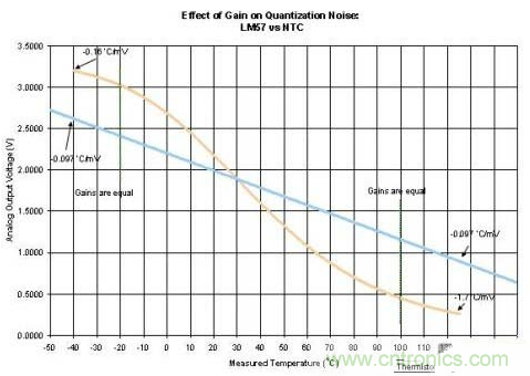 圖4:LM57和NTC熱敏電阻(Murata NCP15XH103F)的噪聲靈敏度比較