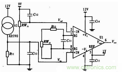 AD590是集成溫度傳感器,輸出為電流,相當(dāng)于恒流源,若要對此進(jìn)行放大需先轉(zhuǎn)換為電壓,可在其回路串入電阻,根據(jù)歐姆定律,電阻上電壓的大小可反映電流的大小,也就是溫度的高低。圖2是溫度傳感器AD590的信號調(diào)理變換電路