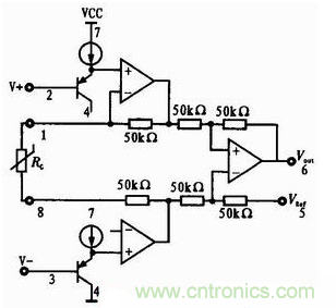 測量300℃的傳感器用Pt1000的鉑電阻,測量范圍:-50~300℃:0℃時(shí)電阻阻值1 000 Ω,300℃時(shí)電阻阻值2 120.515 Ω,反映溫度的物理量是電阻,因此需要設(shè)計(jì)電橋?qū)㈦娮璧淖兓哭D(zhuǎn)換位差模電壓的變換量,然后進(jìn)行信號放大和電平抬升。