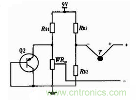 本設(shè)計(jì)采用晶體管PN結(jié)溫度特性進(jìn)行冷端補(bǔ)償,冷端補(bǔ)償電路和熱電偶串聯(lián),如圖5所示。圖中T為熱電偶,其他為冷端補(bǔ)償電路,晶體管選用三極管9012,其電壓溫度變化率約為-2.1 mV/℃,3個(gè)電阻、電位器和PNP三極管組成電橋。當(dāng)冷端溫度升高時(shí),PN結(jié)壓降降低,WR81滑動(dòng)頭電勢降低,WR82和R83中間電勢不變,電橋輸出增大,補(bǔ)償了熱電偶冷端的溫漂,當(dāng)溫度降低則相反。電路的輸出直接連在運(yùn)放AD623的輸入端。