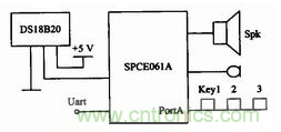 綜上所述,整體硬件電路組成如圖1所示,由SCPE061A單片機(jī)實(shí)現(xiàn)系統(tǒng)整體控制并實(shí)現(xiàn)語音或鍵盤編程與語音播報,系統(tǒng)可通過通用異步串行接口實(shí)現(xiàn)聯(lián)網(wǎng)功能,在不需要聯(lián)網(wǎng)的場合,溫度計也可以單獨(dú)使用,實(shí)現(xiàn)了系統(tǒng)的可裁剪,DSl8B20用來實(shí)現(xiàn)溫度檢測。