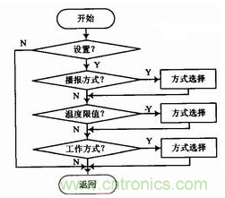 可設(shè)置的參數(shù)主要有,播報方式:“連續(xù)、隔x秒、禁止”;報警溫度值;工作方式等。在需要實(shí)時關(guān)注溫度值的時候,可以設(shè)置為連續(xù)播報;溫度變化較慢的時候可以設(shè)置為隔x秒方式;夜晚設(shè)置報警模式后,可以設(shè)置為禁止播報模式。設(shè)置報警溫度值后可以,可以處理其他事情,在出現(xiàn)警情時,系統(tǒng)給出報警,提示用戶。選擇工作方式為“聯(lián)網(wǎng)工作”后,系統(tǒng)除了現(xiàn)場播報和報警外,還將相應(yīng)信息通過異步串行口發(fā)送到遠(yuǎn)端。設(shè)置過程全部采用語音菜單方式,可以大幅度較低成本,設(shè)置流程圖如圖2所示。