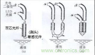 光纖液位傳感器的工作原理如圖3(b)所示。發(fā)光器件射出來的光通過傳輸光纖送到敏感元件,在敏感元件的球面上,有一部分透過,而其余的光被反射回來。當敏感元件與液體相接觸時,與空氣接觸相比,球面部的光透射量增大,而反射量減少。因此,由反射光量即可知道敏感元件是否接觸液體。反射光量決定于敏感元件玻璃的折射率和被測定物質的折射率。被測物質的折射率越大,反射光量越小。來自敏感元件的反射光,通過傳輸光纖由受光器件的光電晶體管進行光電轉換后輸出。敏感元件的反射光量的變化,若以空氣的光量為基準,在水中則為-6-—7dB,在油中為-25—30dB??蓪Ψ瓷涔饬坎顒e很大的水和油等進行物質判別。