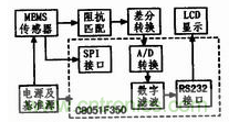 設(shè)計(jì)中采用C8051F350的24位Sigma-Delta模/數(shù)轉(zhuǎn)換器作系統(tǒng)信號(hào)的模數(shù)轉(zhuǎn)換,SPI接口作MEMS傾角傳感器的溫度采集,以實(shí)現(xiàn)對(duì)傳感器的溫度補(bǔ)償,UART作串行LED顯示接口。為保證模/數(shù)轉(zhuǎn)換器工作穩(wěn)定,采用外部基準(zhǔn)源。
