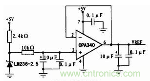 圖5中的輸入為圖4中的參考電壓(VREF)輸出。以低漂移、高穩(wěn)定性運(yùn)放OPA340組成的運(yùn)放電路給傾角傳感器SCA100T提供電源,能保證電源紋波小,工作穩(wěn)定。