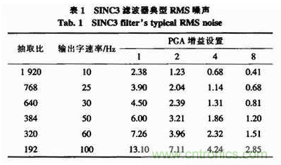 C8051F350內(nèi)部有具有2個(gè)獨(dú)立的抽取濾波器(SINC3濾波器和快速濾波器)和1個(gè)可編程增益放大器。根據(jù)參考文獻(xiàn)SINC3濾波器RMS噪聲小,精度高,缺點(diǎn)是輸出速率較低,而快速濾波器則相反。本設(shè)計(jì)對(duì)速率要求低,而對(duì)精度要求高,因此選用SINC3濾波器。SINC3濾波器典型RMS噪聲如表1所示。