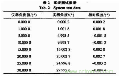 從表2的測試數(shù)據(jù)可知,每個(gè)測試點(diǎn)的偏差有正有負(fù),其主要原因在于這些測試點(diǎn)的曲線擬合是獨(dú)立的,互不影響。另外,在30°時(shí)絕對(duì)誤差最大,最大的絕對(duì)誤差為0.0044°,在1°時(shí)相對(duì)誤差最大,為0.001 8/1≈0.018%。