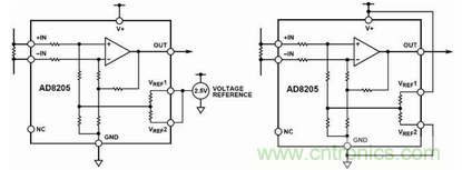 雙極性輸出時(shí)AD8205可以測(cè)量流過(guò)采樣電阻上的雙向電流,這時(shí),輸出可以偏置到輸出范圍內(nèi)的任意位置。當(dāng)被檢測(cè)的正反兩個(gè)方向上的電流為等幅時(shí),其輸出必須偏置到滿量程輸出的中間位置。當(dāng)雙向電流幅值不對(duì)稱時(shí),輸出偏置可以對(duì)應(yīng)地偏離半量程位置。它的兩個(gè)參考輸入VREF1和VREF2分別連接一個(gè)內(nèi)部電阻RREF后接到同一個(gè)內(nèi)部偏置節(jié)點(diǎn),這兩個(gè)參考輸入端的操作方式完全相同。在兩個(gè)參考電壓輸入端接入對(duì)應(yīng)的電壓,即可完成對(duì)輸出的偏置。在雙極性輸出方式下,一般有以下兩種連接方式。