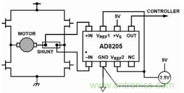 AD8205在H橋馬達(dá)控制電路中作為控制回路的一部分,馬達(dá)和采樣電阻串連后放置在H橋的中間,通過(guò)檢測(cè)采樣電阻上的電壓,可以準(zhǔn)確地測(cè)量馬達(dá)當(dāng)前的電流及其方向。此時(shí),AD8205的輸出被設(shè)定成外部參考雙向的方式,這樣它可以測(cè)量H橋開關(guān)的雙向電流并同時(shí)監(jiān)測(cè)馬達(dá)的運(yùn)轉(zhuǎn)方向。由于地不是一個(gè)特別穩(wěn)定的參考電平,以地為參考將會(huì)導(dǎo)致測(cè)量的不準(zhǔn)確性。因此,這種測(cè)試方案要比以地作為參考電平的測(cè)試方法好的多。