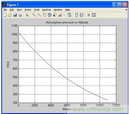其中:P0 是標(biāo)準(zhǔn)大氣壓,等于1013.25 mbar;Altitude是以米為單位的海拔高度。P是在某一高度的以mbar為單位的氣壓,圖1根據(jù)上面的公式描述了大氣壓變化與海拔高度的關(guān)系。
