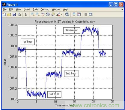 圖2所示是在意法半導(dǎo)體的意大利Castelletto寫字樓內(nèi)采集到的壓力傳感器數(shù)據(jù)。采樣速率是7Hz,數(shù)據(jù)采集時間總計大約23分鐘。從圖中我們可以清晰地看到大氣壓在不同樓層的變化。大氣壓在地下室最高。隨著樓層升高,大氣壓逐漸降低。