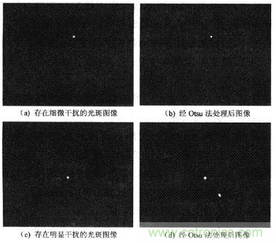 圖4為拍攝到太陽光斑存在干擾時(shí)的圖像,對(duì)比圖4(a)和圖4(b)可發(fā)現(xiàn)用Otsu法分割處理后,能有效消除圖像中細(xì)微干擾。圖4(c)由Otsu法處理后得到圖4(d),光斑圖像坐標(biāo)(160,120),光斑個(gè)數(shù)為2,對(duì)應(yīng)FYP和FWP為O。由此判斷拍攝的圖像存在明顯干擾,程序?qū)YP和FWP置為O,確保系統(tǒng)的可靠性。