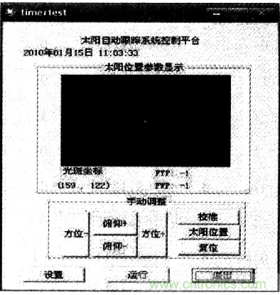 上位機(jī)可執(zhí)行程序控制界面如圖5所示,上位機(jī)控制平臺(tái)具有實(shí)現(xiàn)復(fù)位,太陽位置的跟蹤、手動(dòng)校準(zhǔn)。其中“設(shè)置”按鈕,可進(jìn)行波特率、調(diào)整時(shí)間間隔等的設(shè)置。