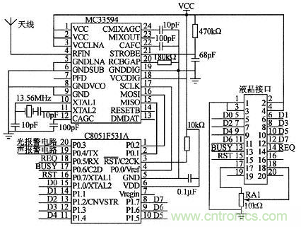 主控制器電路原理如圖3所示。主控制器模塊采用穩(wěn)定、可靠的微控制器C8051F531A,其內(nèi)置振蕩電路和增強型的SPI接口,外擴SPI無線接收芯片MC33594和操作簡單、方便的并行液晶模塊。