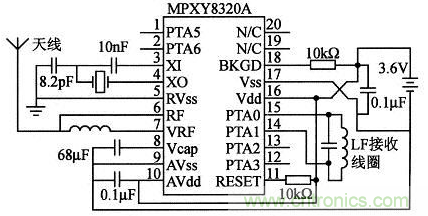 檢測模塊由胎壓測量專用高集成芯片MPXY8320A微控制器和電源組成,檢測模塊電路原理如圖4所示。MPXY8320A工作在DC 2.1~3.6 V,具有低功耗的效能以延長電池壽命。MPXY8320A最大的特點是,其內(nèi)部集成了8位MCU、適應(yīng)載重型輪胎的壓力傳感器、溫度傳感器、供電電源電壓監(jiān)測、X-Z軸上的加速度傳感器以及RF發(fā)送模塊,所以MPXY8320A是一款專為交通工具胎壓測量而設(shè)計的高集成芯片。由于器件的高集成度,在體積上、功耗上、電磁兼容性方面都有很出色的表現(xiàn)。