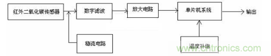 檢測(cè)電路由紅外二氧化碳傳感器、數(shù)字濾波電路、放大電路、穩(wěn)流電路、單片機(jī)系統(tǒng)、溫度補(bǔ)償?shù)冉M成?;驹硎羌t外二氧化碳傳感器將檢測(cè)到的二氧化碳?xì)怏w濃度轉(zhuǎn)換成相應(yīng)的電信號(hào),輸出的電信號(hào)分別經(jīng)過濾波、放大處理,輸入到單片機(jī)系統(tǒng),并經(jīng)溫度和氣壓補(bǔ)償?shù)忍幚砗螅蓡纹瑱C(jī)系統(tǒng)輸出送顯示裝置顯示其測(cè)量值。
