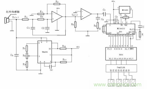 按照上述設(shè)計(jì)原理,設(shè)計(jì)的二氧化碳檢測(cè)電路如圖3所示。工作原理是首先由紅外傳感器將探測(cè)到二氧化碳?xì)怏w的濃度并轉(zhuǎn)換成電信號(hào),濾波電路提取電信號(hào)并輸出到放大電路,經(jīng)過單片機(jī)系統(tǒng)處理后輸出,再由74AC138送入顯示電路,以實(shí)現(xiàn)對(duì)二氧化碳?xì)怏w濃度的檢測(cè)。