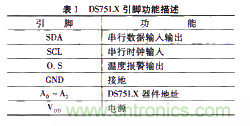 DS75LX工作電壓為1.7 V到3.7 V。除了基本的測(cè)溫功能外,DS75LX還具有溫度報(bào)警功能,允許用戶通過(guò)軟件設(shè)置報(bào)警溫度的門(mén)限值。DS75LX測(cè)溫范圍為-55℃~+125℃,當(dāng)測(cè)溫范圍為-25℃~+100℃時(shí),測(cè)量精度為±2℃。DS75LX同時(shí)具有可編程的9至12位的溫度數(shù)據(jù)輸出格式。輸出的溫度數(shù)據(jù)為12位時(shí),其分辨率可達(dá)0.0625℃。該傳感器具有三個(gè)地址引腳,可設(shè)置為三種狀態(tài)中的任意一種:接GND、VDD,或懸空,可設(shè)置27種地址組合。例如A2、A1和A0分別為接電源、接地和懸空時(shí),DS75LX的器件地址為0101110。圖1是DS75LX的引腳排列,各功能描述如表1所示。