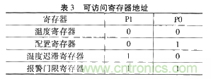 寄存器指針是向用戶提供所要訪問(wèn)寄存器地址,寄存器指針的內(nèi)容即為可訪問(wèn)寄存器地址。由于DS75LX內(nèi)部只含有4個(gè)可訪問(wèn)寄存器,因此寄存器指針的內(nèi)容只有低兩位(P1、P0)有效,當(dāng)訪問(wèn)某個(gè)寄存器時(shí),必須確保寄存器指針已指向該寄存器。P1和P0的值與可訪問(wèn)寄存器對(duì)應(yīng)關(guān)系如表3所示。