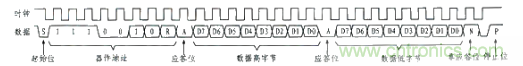 DX75LX的讀寫(xiě)操作是通過(guò)兩線串行總線接口實(shí)現(xiàn)的,該串行總線與I2C總線兼容。圖2所示為讀溫度及溫度門(mén)限寄存器的時(shí)序圖。此時(shí)假定寄存器指針已指向溫度寄存器,否則需要對(duì)指針進(jìn)行設(shè)置。設(shè)置方法如下:主器件產(chǎn)生起始位、發(fā)送包含DS75LX地址的寫(xiě)命令、收到應(yīng)答、發(fā)送寄存器指針字節(jié)。注意只有指針字節(jié)的低兩位(P1、P0位)有效。