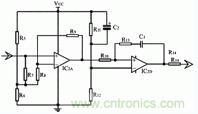 由R5~R9及IC 2A組成前級放大電路,由R5、R6輸入偏置靜態(tài)工作點(diǎn),對C1耦合過來的微弱尖脈沖信號進(jìn)行放大,其增益的大小取決于R8和R9的比值。整形調(diào)制電路由R11~R13、C3及IC 2D組成,將前級尖脈沖信號整形調(diào)制為等幅方波脈沖信號。見圖2。