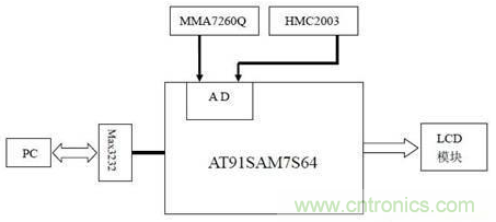 本系統(tǒng)的硬件結構如圖2所示。由于At91sam7s64具有片上A/D轉換器而且具有8選1模擬復用器,使得MMA7620Q和HMC2003可以直接與微控制器相連而不必外加A/D轉換器和復用器,不僅降低了系統(tǒng)的成本和體積,提高了系統(tǒng)的集成度,同時減少了誤差源,提高了精度。經過A/D轉換的測量數據經過ARM核的處理后,被送到串口LCD并通過RS232接口送入PC機進行進一步的分析。