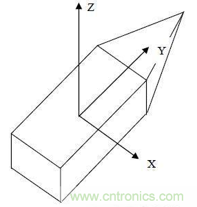 在本系統(tǒng)中,三軸加速度計和三軸MR傳感器都以以下的方式安裝于電路板上:它們的X軸平行于系統(tǒng)的橫軸指向右,Y軸平行于系統(tǒng)的縱軸指向前,X、Y、Z軸定義為右手坐標系統(tǒng),如圖2所示。