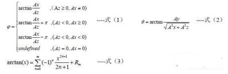 為了獲得系統(tǒng)基于重力向量的俯仰角θ和橫滾角φ,需要使用加速度計的三個輸出:Ax, Ay, Az.俯仰角和橫滾角可以通過以下公式(1)和公式(2)計算得到。對于微控制器,函數中的arctan(x)需要通過以下公式(3)的泰勒展開后才能計算得到。