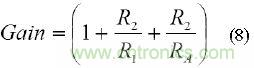 其中, VIN(MAX)為傳感器預(yù)期的最大失調(diào)。等式(5)同時(shí)顯示, 調(diào)整電路的插入會修改從輸入到輸出的增益。即使如此,其影 響一般也很小,增益可以重新計(jì)算為:
