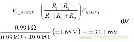 由于DAC可以擺動(dòng)±1.65 V,因此,總失調(diào)調(diào)整范圍可通過由RA 以及R1和R2的并聯(lián)組合形成的分壓器給定,其計(jì)算方法如下: