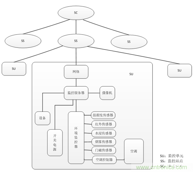 動力環(huán)節(jié)監(jiān)測系統(tǒng)應用在機房、基部站等無人值守的環(huán)境中,對局站內的通訊電源、蓄電池組、UPS、發(fā)電機、空調等智能、非智能設備以及溫濕度、煙霧、地水、門禁等環(huán)境量實現(xiàn)“遙測、遙信、遙控、遙調”等功能。為了實現(xiàn)對多個量的監(jiān)測,動環(huán)系統(tǒng)集成了各種類的傳感器,是多傳感器集成系統(tǒng)傳感器“多類型”的一個經典案例。同時,此監(jiān)控系統(tǒng)充分利用了通訊傳輸設備所能提供的各種傳輸信道資源,可以實現(xiàn)多級網管,能夠對所有局站的全參數(shù)、全方位的監(jiān)控,這又很好體現(xiàn)了多傳感器集成系統(tǒng)傳感器“多數(shù)量”的一面。動環(huán)監(jiān)測系統(tǒng)的組成如下: