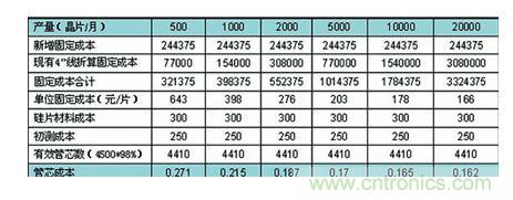 4”圓晶片生產(chǎn)線生產(chǎn)MEMS壓力傳感器Die成本估計(jì)如表所示,新增固定成本是指為該項(xiàng)目投入的人員成本和新設(shè)備的折舊(人員:專(zhuān)家1名+MEMS設(shè)計(jì)師2名+工程師4名+工藝師5名+技工12名,年成本147萬(wàn)元,新增設(shè)備投入650萬(wàn)元,按90%四年折舊計(jì)算);現(xiàn)有4”線成本是指在5次光刻條件下使用4”線的成本(包括人工、化劑、水電、備件等的均攤成本);硅片材料成本是指雙拋4寸硅片的價(jià)格。