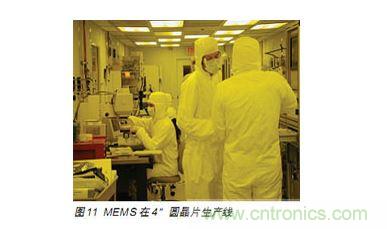 與傳統(tǒng)IC行業(yè)注重二維靜止的電路設(shè)計(jì)不同,MEMS以理論力學(xué)為基礎(chǔ),結(jié)合電路知識(shí)設(shè)計(jì)三維動(dòng)態(tài)產(chǎn)品。對(duì)于在微米尺度進(jìn)行機(jī)械設(shè)計(jì)會(huì)更多地依靠經(jīng)驗(yàn),設(shè)計(jì)開(kāi)發(fā)工具(Ansys)也與傳統(tǒng)IC(如EDA)不同。MEMS加工除了使用大量傳統(tǒng)的IC工藝,還需要一些特殊工藝,如雙面刻蝕,雙面光刻等。MEMS比較傳統(tǒng)IC,工藝簡(jiǎn)單,光刻步驟少,MEMS生產(chǎn)的一些非標(biāo)準(zhǔn)的特殊工藝,工藝參數(shù)需要按照產(chǎn)品的要求來(lái)進(jìn)行調(diào)整。由于需要產(chǎn)品設(shè)計(jì)、工藝設(shè)計(jì)和生產(chǎn)三方面的密切配合,IDM的模式要優(yōu)于Fabless+Foundry的模式。MEMS對(duì)封裝技術(shù)的要求很高。傳統(tǒng)半導(dǎo)體廠商的4〃生產(chǎn)線正面臨淘汰,即使用來(lái)生產(chǎn)LDO,其利潤(rùn)也非常低,但是,如果生產(chǎn)MEMS,則可獲得較高的利潤(rùn)。4〃線上的每一個(gè)圓晶片可生產(chǎn)合格的MEMS壓力傳感器Die5-6K個(gè),每個(gè)出售后,可獲成本7-10倍的毛利(如圖10)。轉(zhuǎn)產(chǎn)MEMS對(duì)廠家的工藝要求改動(dòng)不大,新增輔助設(shè)備有限,投資少、效益高。MEMS芯片與IC芯片整合封裝是集成電路技術(shù)發(fā)展的新趨勢(shì),也是傳統(tǒng)IC廠商的新機(jī)遇。圖11是MEMS在4〃圓晶片生產(chǎn)線上。