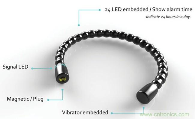 而手鏈采用磁性連接頭作為連接環(huán),連接頭上有指示燈,通過不同的顏色來指示電池的電量,連接頭也有USB接口,可以通過適配器來為智能手鏈充電。同時(shí)這款智能手鏈內(nèi)置了藍(lán)牙模塊,可以通過藍(lán)牙連接智能手機(jī),用戶可以通過手機(jī)程序來設(shè)置鬧鐘時(shí)間,讓智能手鏈用溫柔的震動(dòng)喚醒自己。