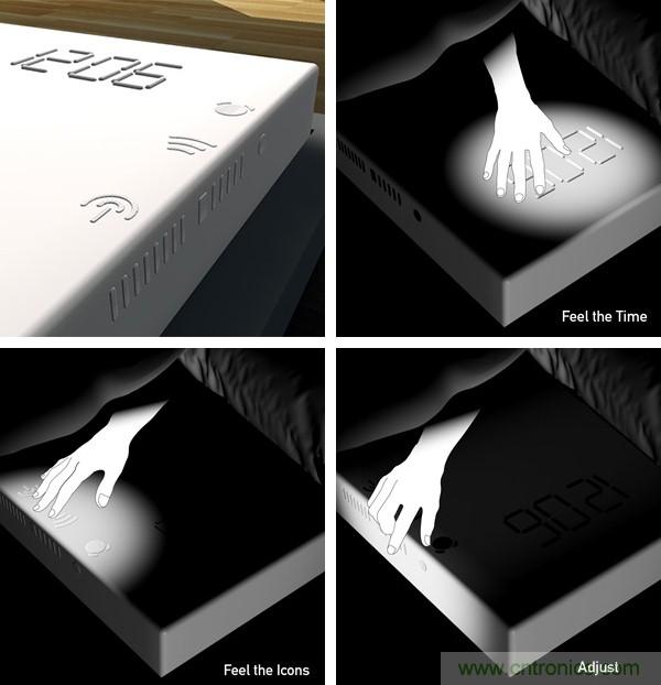 開關(guān)、音量調(diào)節(jié)、功能設(shè)置等凸起按鈕,它們都被隱藏在床單下面,不必睜開雙眼,通過觸摸,我們就可以知曉和調(diào)節(jié)時(shí)間。這些模塊是采用一種仿生材料制成的,這種材料又被稱為人工肌肉。它通過收縮或者膨脹來改變外形,從而達(dá)到變幻時(shí)間顯示數(shù)字的效果。